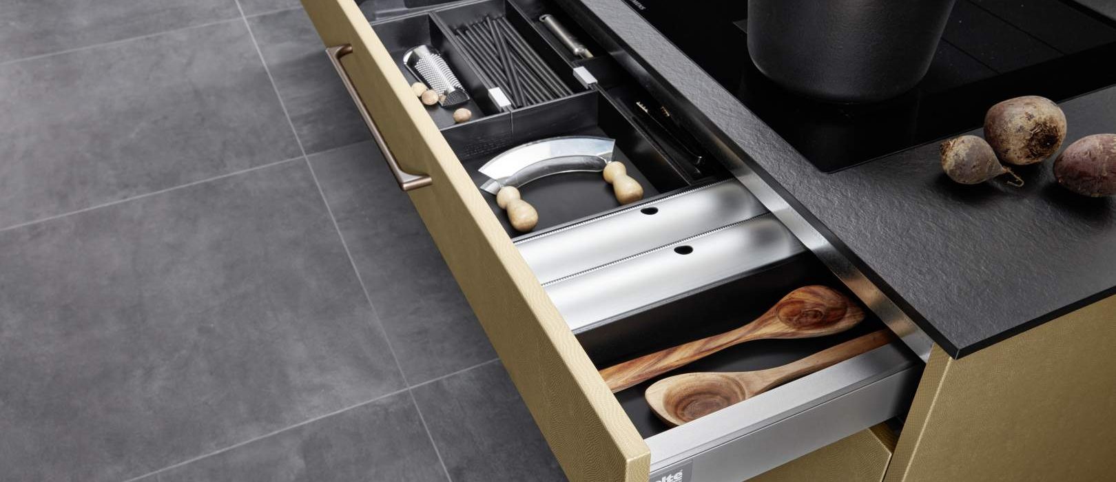 Con MATRIX150, sotto molti piani cottura sono possibili cassetti perfettamente funzionanti, anche in combinazione con piani di lavoro da 12 mm. La superficie del piano di lavoro in PRO nero completa perfettamente l’impressione generale.
