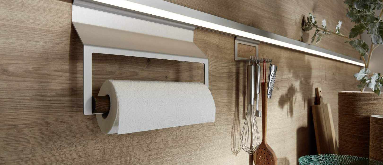 Ogni utensile da cucina ha il suo posto con gli elementi della rotaia.