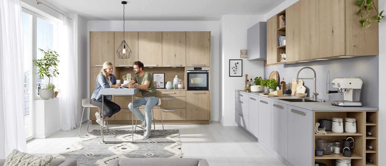Casa dall’atmosfera giovane: TAVOLA in pinot di quercia e SOFT LACK in grigio papiro.