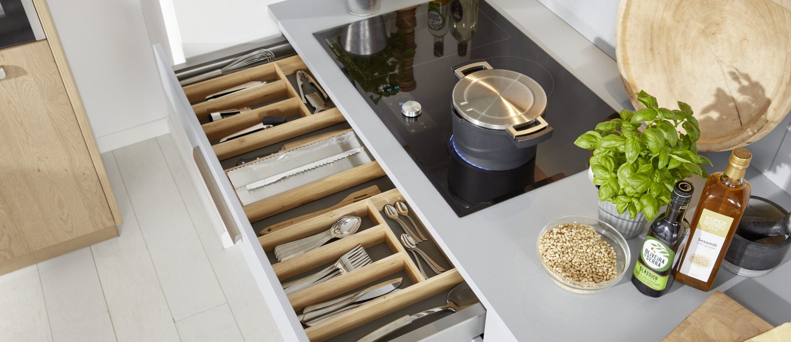 Sotto il piano cottura a induzione, l’intelligente griglia Matrix 150 lascia spazio anche a un cassetto.