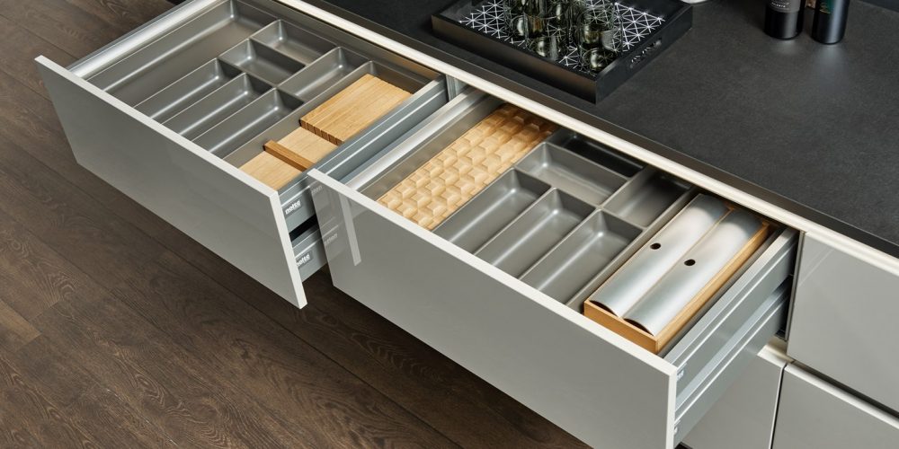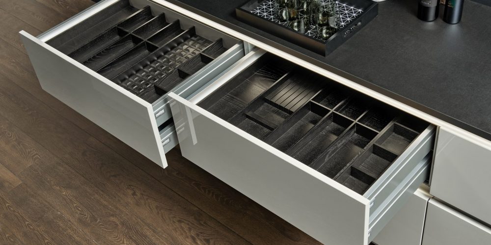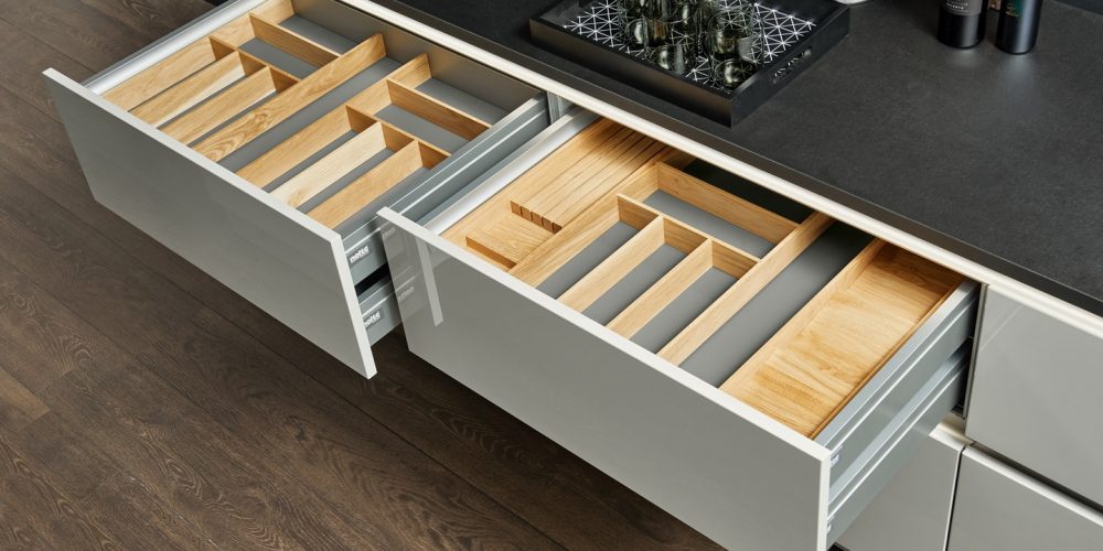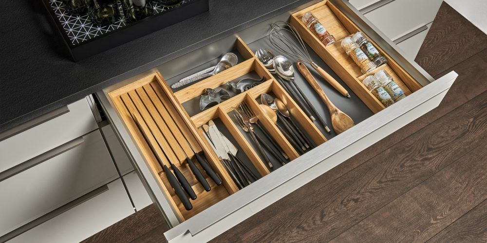 Facile da pulire. Gli inserti per le posate sono disponibili per ogni larghezza del cassetto, oltre a pratici divisori trasversali e divisioni di profondità per gli estraibili.