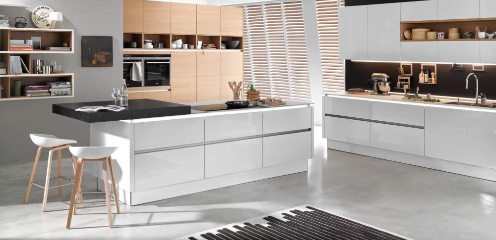 Nova Lack Nature, un invito a Vivere in Cucina Uno scaffale pensile individuale rende la cucina un accogliente soggiorno. Il piano di lavoro in vetro entusiasma non solo dal punto di vista ottico ma anche grazie al lavello incassato a filo con la superficie.